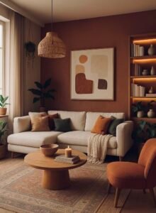 Lighting sets the mood. A combination of table lamps, string fairy lights, and a statement pendant light will make your space glow with warmth. This layered lighting effect keeps the room cozy without being too dim.