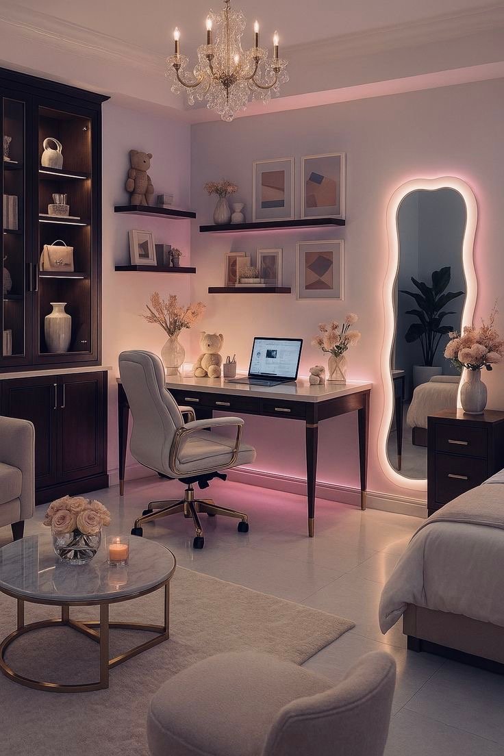 Looking for the perfect balance between productivity and relaxation? This dreamy setup blends luxury home office vibes with bedroom comfort, making it the ultimate inspiration for anyone who wants their space to feel both functional and stylish. From the glam chandelier to the LED-lit mirror, every detail screams modern elegance.